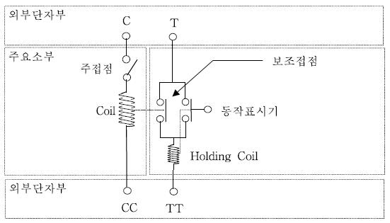 보조접점은 주접점과 병렬로 연결되어 있으며 이를 동작시키는 홀딩코일(Holding Coil)은 주접점과 직렬로 연결되어 있어 주접 점 동작에 의해 홀딩코일(Holding Coil)에 전류가 흐르면 보조접 점이 폐로되어 트립(Trip)전류가 흐르는 동작 주접점을 단락하여 폐로를 확실히 하는 동시에 주접점이 개로될 때 접점보호 역 할을 한다.