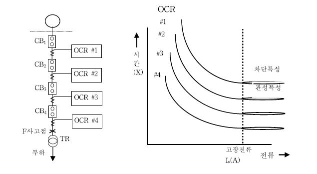 한편 자가용 수용가 구내의 전기계통도는 수전점에서 부하로의 전력선로에 몇 개의 구분점이 있고 이 구분점마다 보호장치를 설치하여 부하 말단에서 수전점으로 향해 한시차보호방식에 의 한 보호협조(선택차단)를 하도록 고려하고 있다. 따라서 부하말 단에서 순차 계전기 동작시간이 차츰 길어져 수전점 계전기의 동작시간이 가장 길어진다.