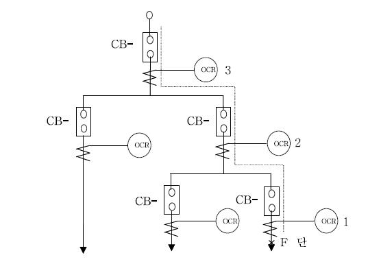 그림의 F점에서 단락사고가 발생하면 가장 가까운 점의 차 단기 CB-1을 차단하도록 계전기 1의 동작시간을 짧은 값으로 정정해두어야 한다.