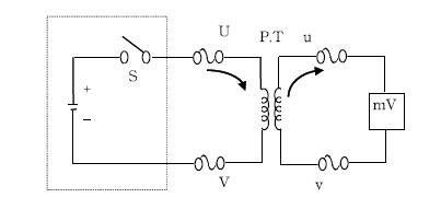 PT 2차권선의 u(+) 및 v(-) 단자에 직류 mV 전압계를 접속하 고, PT 1차측에서 U(+) 및 V(-)단자에 건전지(직류1.5V 또는 3V정도)의 전압을 개폐스위치 S로 ON→OFF 한다.