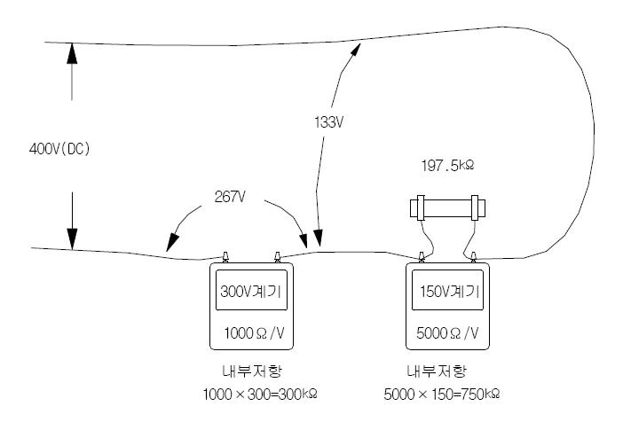 (a) 전압계 그림 같이 2개 또는 3개이상의 계기의 각 전압 의 합이 선간 전압이다. 이때 사용하는 계기의 문자판을 보 고 볼트당 저항 (5000Ω/V,1000Ω/V등)을보고 그 수치가 같 은 계기를 사용하면 각 계기가 같은 진동을 하므로 최대로 각 정격의 합계까지 측정할 수 있다. 같은 1000Ω/V의 계 기로 300V의 것과 400V의 것을 직렬로 하여 400V회로에 접 속하면 정확히 300V와 100V를 지시하게 된다. 그림 같 이 Ω/V가 다른 계기를 사용하면 이 경우에는 300V의 계기 에는 114V가 가해지고 150V쪽은 286V가 가해지게 된다. 이때 적당한 저항을 전압계단자에 병렬로 연결하면 지시치 배 분을 적당하게 가해지도록 할 수 있다. 그림 5의 경우에서